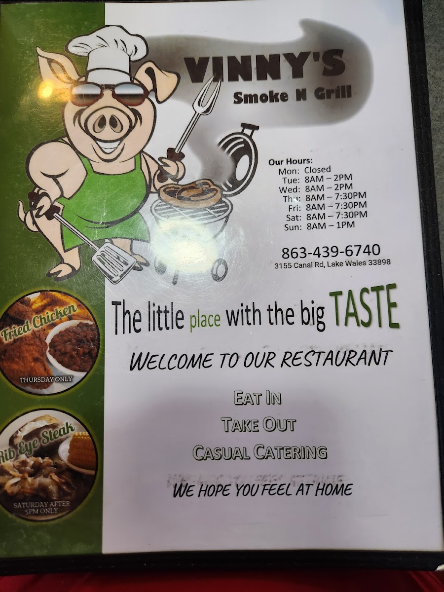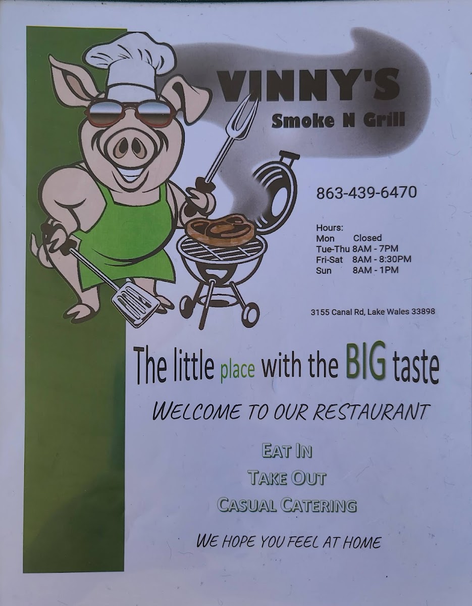 Welcome to Vinnys Smoke N Grille, a hidden gem nestled in Lake Wales, Florida. This cozy eatery, located at 3155 Canal Rd, brings a casual and intimate dining experience, perfect for unwinding after a day of hiking or exploring.